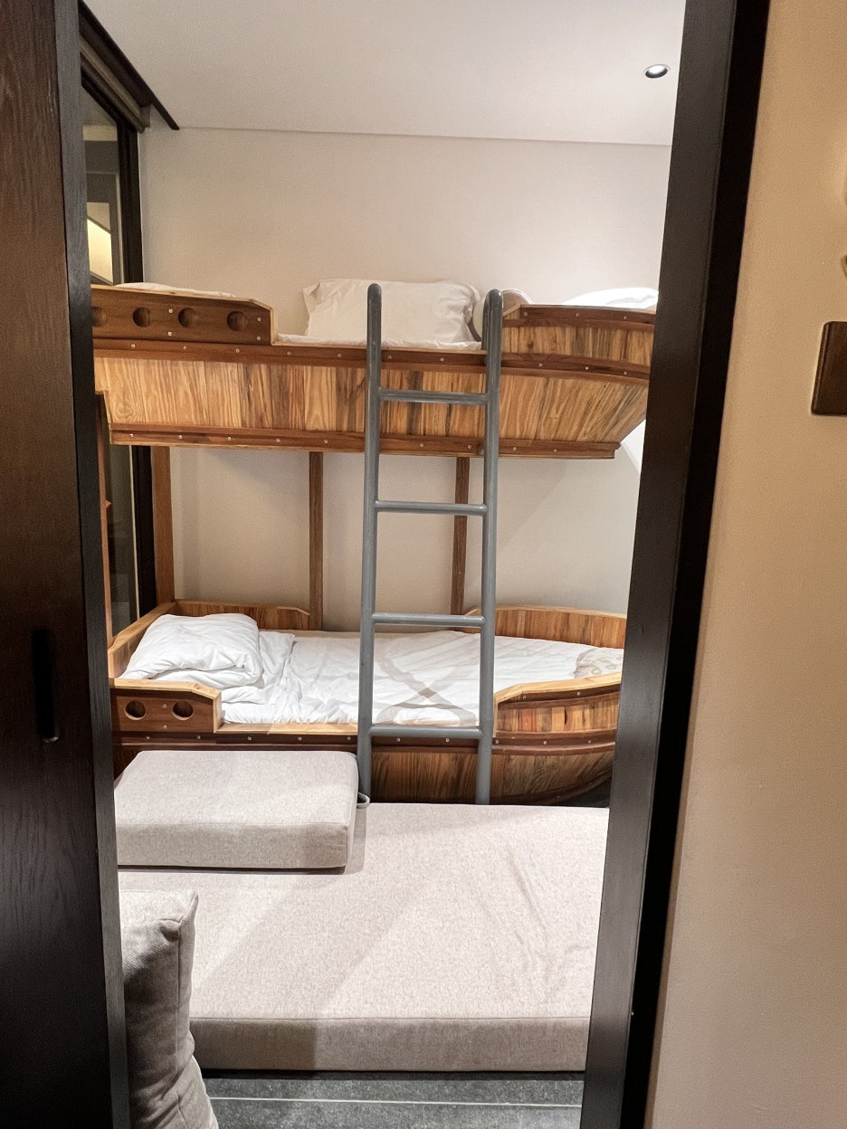 2층 침대가 있는 칠드런 룸은 침대 2개, 작은 협탁, 화장실로 구성되어 있습니다.